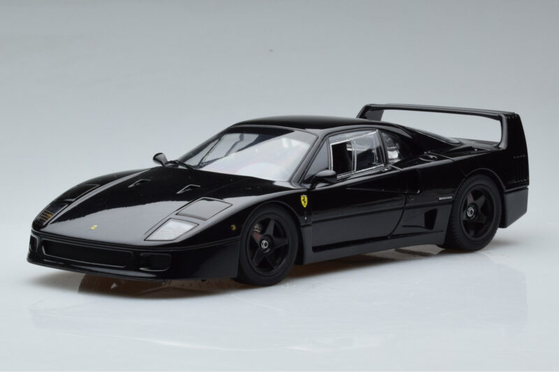 The Ferrari F40 Lightweight Noir Kyosho 1:18 is crafted from Métal Moulé. Die-cast zinc alloy body with detailed plastic parts, rubber tires, and high-quality paint finish. Die-cast models are known for their weight, durability, and realistic feel.