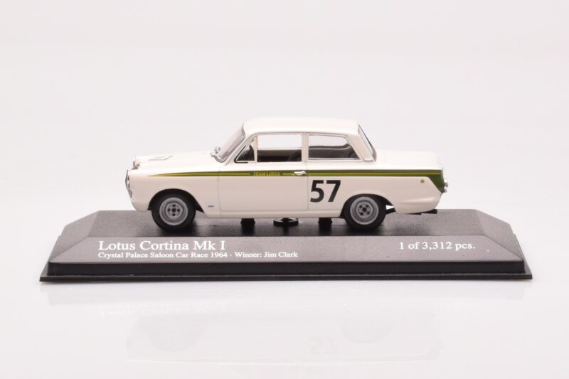 The Lotus Cortina Mk1 #57 J. Clark Crystal Palace Winner 1964 Minichamps 1:43 is crafted from Métal Moulé. Die-cast zinc alloy body with detailed plastic parts, rubber tires, and high-quality paint finish. Die-cast models are known for their weight, durability, and realistic feel.