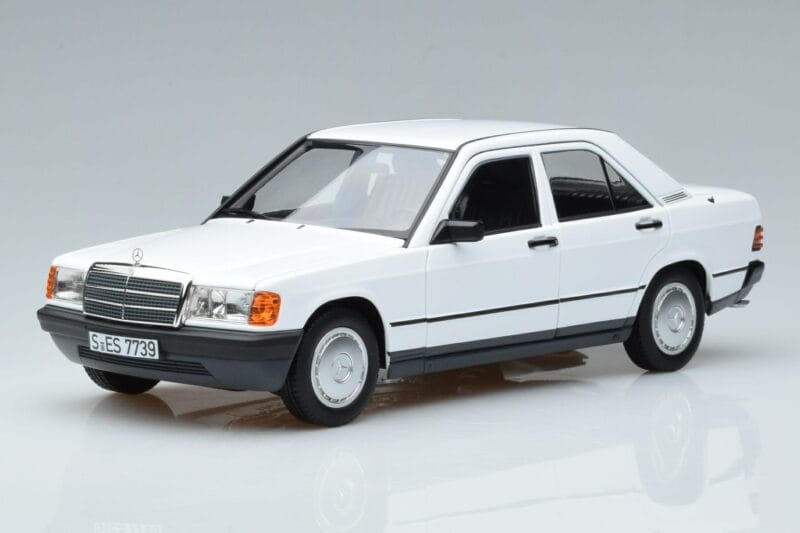 The Mercedes 190 E W201 Blanc Norev 1:18 is crafted from Métal Moulé. Die-cast zinc alloy body with detailed plastic parts, rubber tires, and high-quality paint finish. Die-cast models are known for their weight, durability, and realistic feel.