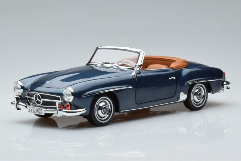 The Mercedes 190 SL W121 Roadster Bleu Norev 1:18 is crafted from Métal Moulé. Die-cast zinc alloy body with detailed plastic parts, rubber tires, and high-quality paint finish. Die-cast models are known for their weight, durability, and realistic feel.