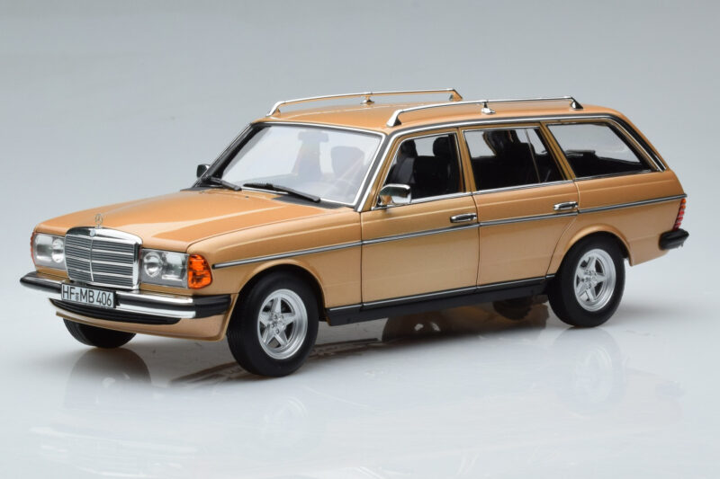 The Mercedes 200T S123 AMG Package Beige Norev 1:18 is crafted from Métal Moulé. Die-cast zinc alloy body with detailed plastic parts, rubber tires, and high-quality paint finish. Die-cast models are known for their weight, durability, and realistic feel.