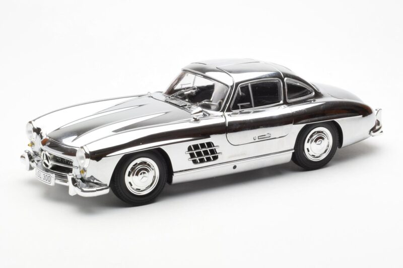 The Mercedes 300 SL W198 Chrome Minichamps 1:18 is crafted from Métal Moulé. Die-cast zinc alloy body with detailed plastic parts, rubber tires, and high-quality paint finish. Die-cast models are known for their weight, durability, and realistic feel.
