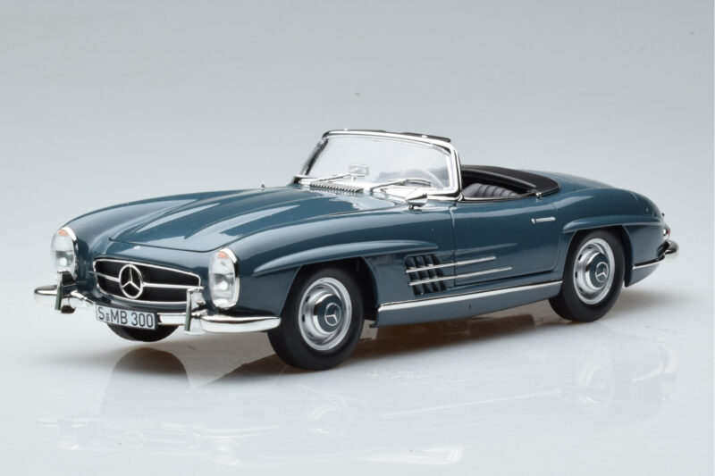 The Mercedes 300 SL W198 Roadster Bleu Norev 1:18 is crafted from Métal Moulé. Die-cast zinc alloy body with detailed plastic parts, rubber tires, and high-quality paint finish. Die-cast models are known for their weight, durability, and realistic feel.
