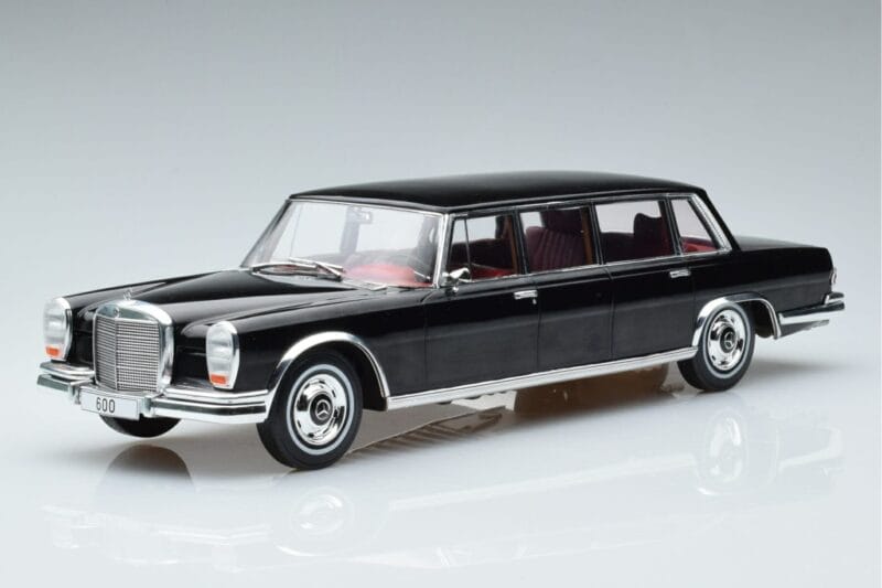 A 1:18 scale model measures approximately 25-28 cm (approximately 10-11 inches). The Mercedes 600 LWB Pullman W100 Noir MCG 1:18 is perfect for display in a glass cabinet or on a shelf.