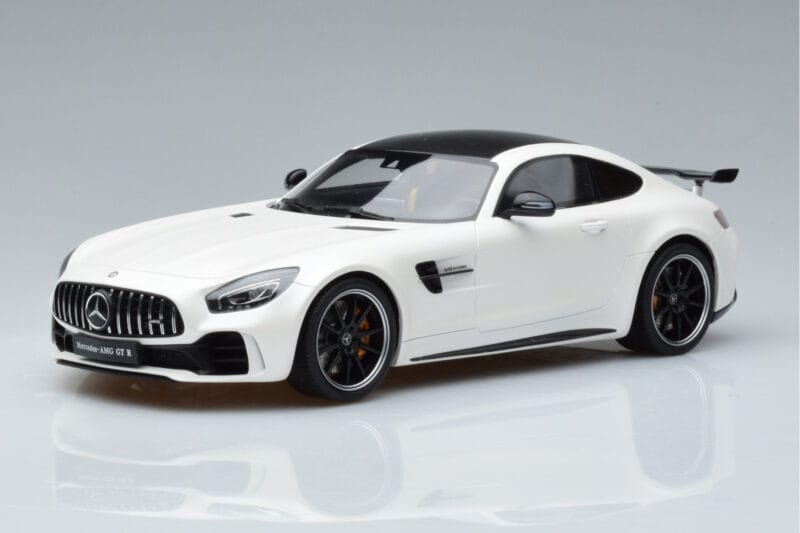 A 1:18 scale model measures approximately 25-28 cm (approximately 10-11 inches). The Mercedes AMG GT R Blanc GT Spirit 1:18 is perfect for display in a glass cabinet or on a shelf.