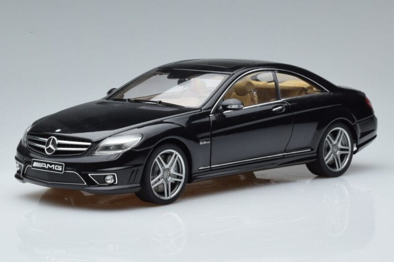 The Mercedes CL63 AMG C216 Noir AUTOart 1:18 is crafted from Métal Moulé. Die-cast zinc alloy body with detailed plastic parts, rubber tires, and high-quality paint finish. Die-cast models are known for their weight, durability, and realistic feel.