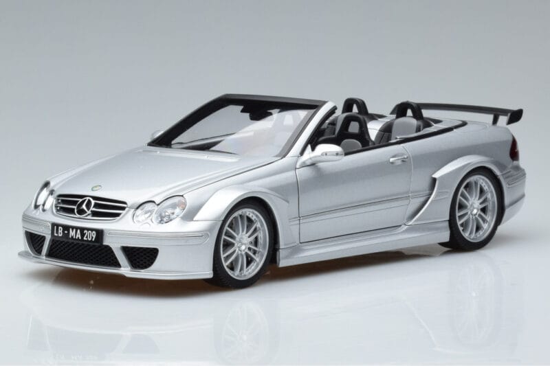 The Mercedes CLK DTM AMG W209 Cabriolet Argent Kyosho 1:18 is crafted from Métal Moulé. Die-cast zinc alloy body with detailed plastic parts, rubber tires, and high-quality paint finish. Die-cast models are known for their weight, durability, and realistic feel.