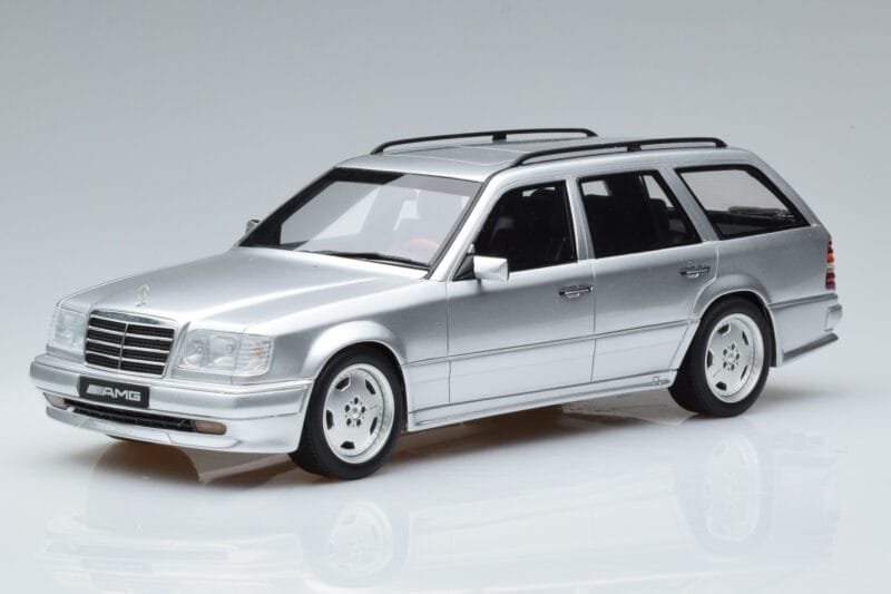 A 1:18 scale model measures approximately 25-28 cm (approximately 10-11 inches). The Mercedes E36 AMG S124 Argent Otto 1:18 is perfect for display in a glass cabinet or on a shelf.