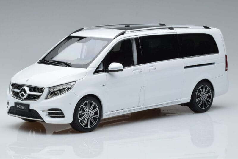 The Mercedes V-Class W447 V260L Blanc Mercedes 1:18 is crafted from Métal Moulé. Die-cast zinc alloy body with detailed plastic parts, rubber tires, and high-quality paint finish. Die-cast models are known for their weight, durability, and realistic feel.