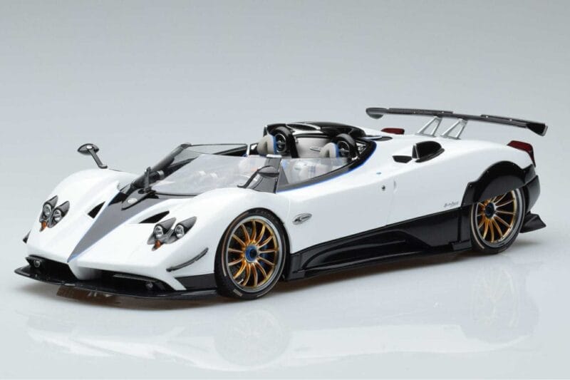 The Pagani Zonda HP Barchetta Carbon Fiber Blanc LCD 1:18 is crafted from Métal Moulé. Die-cast zinc alloy body with detailed plastic parts, rubber tires, and high-quality paint finish. Die-cast models are known for their weight, durability, and realistic feel.
