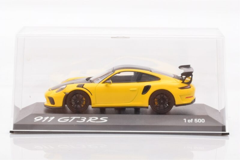 The Porsche 911 991.2 GT3 RS Jaune Minichamps 1:43 is crafted from Métal Moulé. Die-cast zinc alloy body with detailed plastic parts, rubber tires, and high-quality paint finish. Die-cast models are known for their weight, durability, and realistic feel.